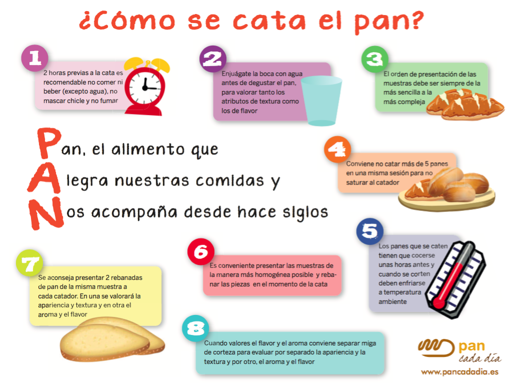 Pese a que aún no existe un método estandarizado para la evaluación organoléptica del pan, María Jesús Callejo, profesora titular del Departamento de Química y Tecnología de los Alimentos de la Universidad Politécnica de Madrid y experta en cereales, afirma que “en general, los atributos sensoriales de los alimentos se pueden clasificar en función de los sentidos involucrados en su percepción, aquellos relacionados con: la vista (atributos de apariencia), el tacto (atributos de textura, en mano y en boca), el olfato (atributos de olor/aroma), olfato y gusto (atributos de flavor), e, incluso, el oído (crujencia del pan)”. Además, existen algunos consejos que nos pueden ayudar a iniciarnos en el tema y que se muestran en esta infografía.